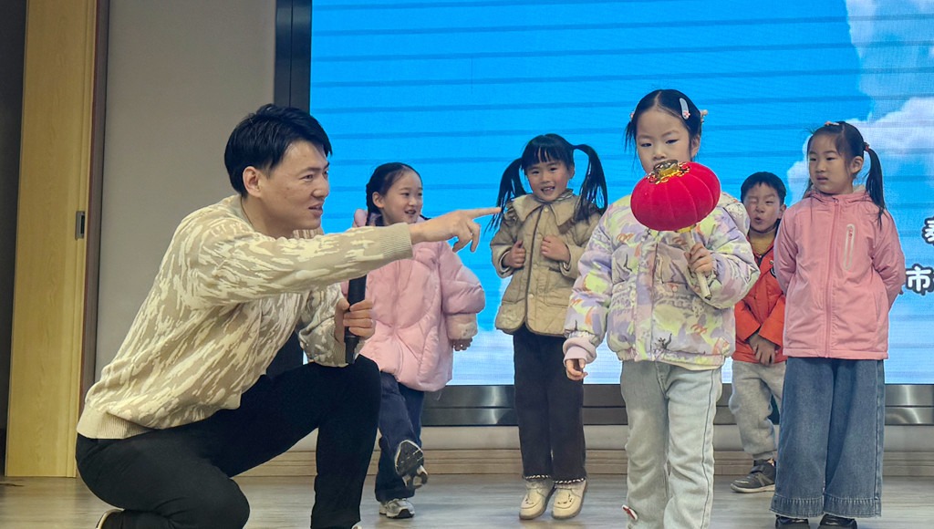 非遗传承人——胡盛,走进文江园,他用故事串联泰兴花鼓的历史脉络,讲述了泰兴花鼓的起源、发展以及表演技巧,并现场示范、教授“颠三步”“喜鹊登梅步”“四方步”等经典步伐。孩子们看得目不转睛,跃跃欲试。胡盛老师耐心地蹲下身子,手把手指导孩子们调整姿势。渐渐地,孩子们的动作从笨拙到流畅,会场里洋溢着欢声笑语。