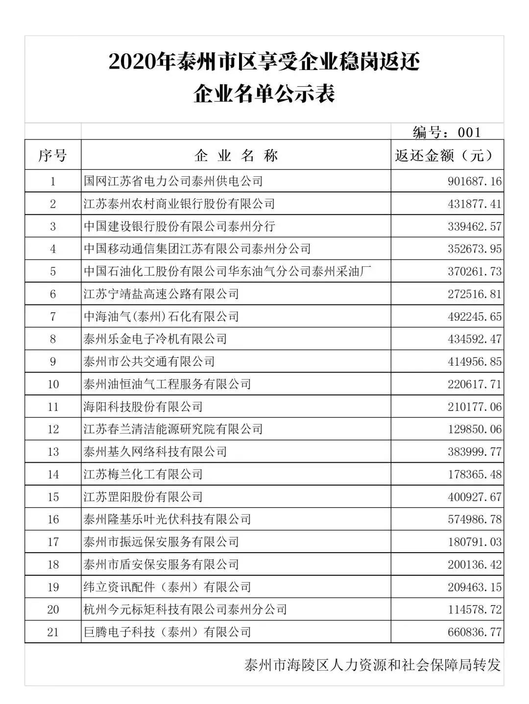 稳岗补贴更给力 泰州市海陵区人社局实施了更加给力的稳岗返还补贴措施,让企业足不出户就能拿到“真金白银”。对泰州市正常参保的企业,上年度没有裁员或少裁员,返还缴纳的失业保险费用,返还标准为企业及其职工上年度实际缴纳失业保险费的50%,将中小微企业稳岗返还裁员率由2019年的3.8%放宽到5.5%;同时对参保职工30人(含)以下的企业,裁员率标准放宽至不超过企业职工总数的20%。