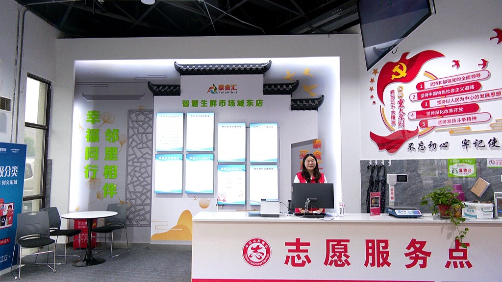 在城东智慧生鲜市场,大门入口处不仅设立了志愿服务点,向市民提供公平秤、急救箱、雨伞、开水等服务,还设立了顾客休息区以及泰兴美食非遗展示区。诚信经营、讲文明树新风等社会公益宣传氛围浓厚。市场采用超市布局模式,物品摆放整齐,环境干净整洁。“落实保安人员加强菜场内外的巡查,禁止菜场内吸烟以及宠物狗入内,同时规范周边车辆停放管理,为市民营造一个良好的购物环境。”市场管理员郭国良介绍。