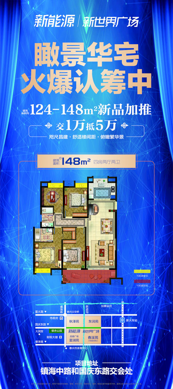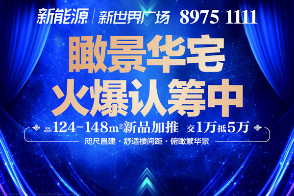 新能源·新世界广场 瞰景华宅 建筑面积约124~148㎡新品加推,交1万抵5万,全城火爆认筹中。紧邻繁华商业昌建广场,出门就可逛街的房子,超舒适楼间距,前后无遮挡,俯瞰繁华景,预约热线:89751111