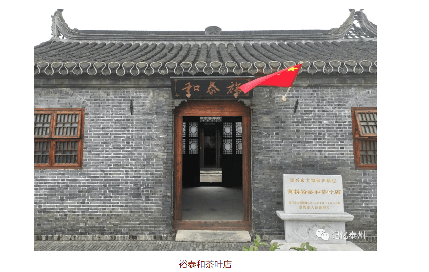 黄桥镇东进路,是一条横穿老镇区的主街道,曾是如(皋)泰(兴)官道的镇区段。这条路自东向西由处于同一条直线上的口巷、东大街、西大街、西街组成。东大街是老黄桥最繁华的商业街之一,历史上的东大街仅有250 米长、3-4 米宽,却集中了50多家布店、烟店、茶叶店、杂货店、广货店、药铺、当铺、书铺。这条街上曾经有许多百年老字号,虽然商号已经消失,但这些商家的传奇故事仍流传不绝。仁源生药店研制的蟾酥曾于1915年获万国博览会铜奖,裕泰和茶叶店曾创出享誉苏北地区的品牌。东进路经过多次拓宽改造,已经成为一条现代商业街,但是转入小巷,就是传承历史的巷道、民居,历史与现代相融于沿街一排店面房。裕泰和茶叶店位于东进路南侧,安徽绩溪人胡沇源创办于1876年,三间四进,前店后坊。