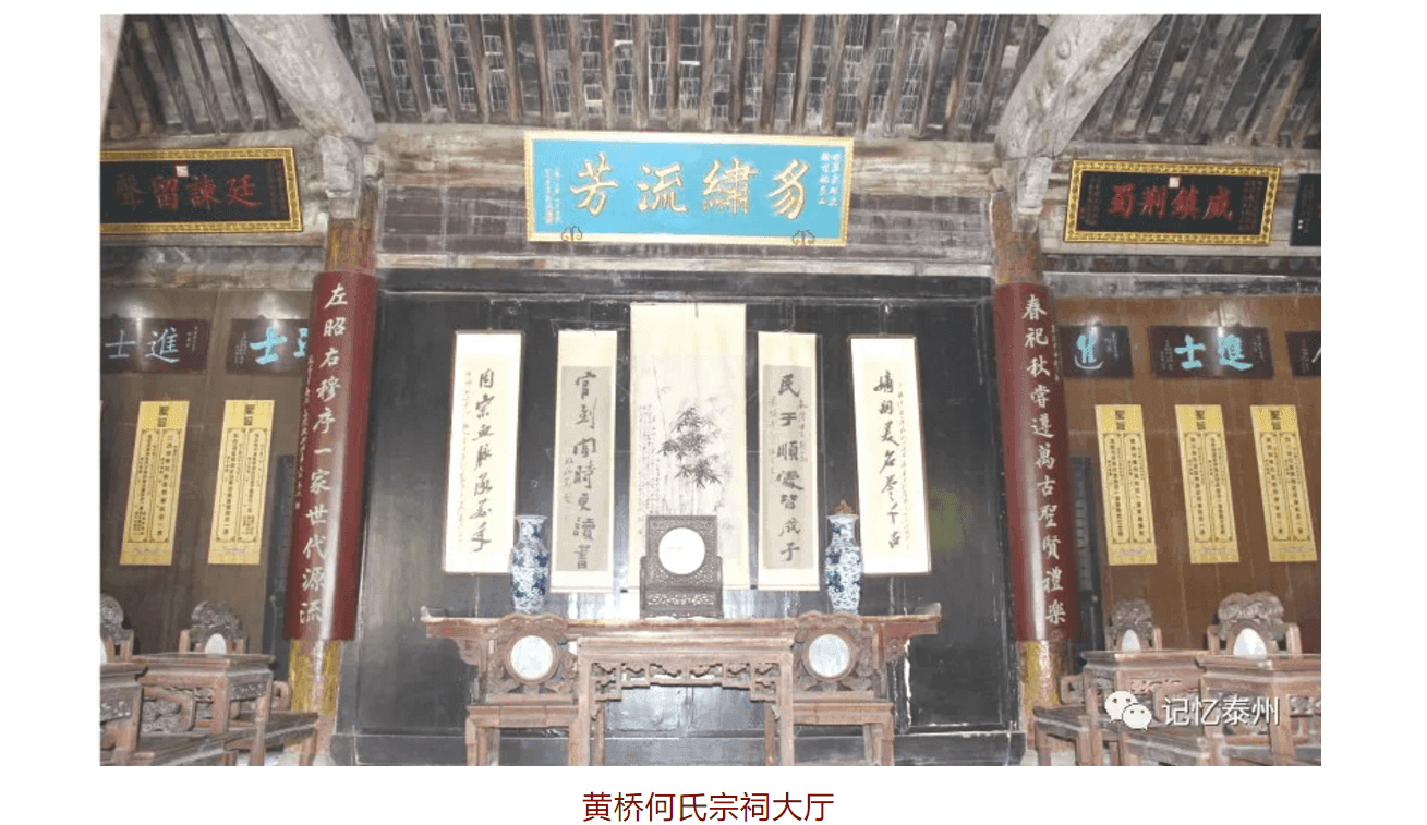 黄桥镇的珠巷长约350米,历史上珠巷称猪巷,巷道两侧多是猪行,后来猪行外迁,取而代之的是各式商铺。人们逐渐将猪巷改称珠巷,1921年丁文江主持绘制的黄桥镇区图上就已经标注为“珠巷”。珠巷西边有一深庭古院,为何氏宗祠。何氏制定《家范条件十则》,内容包括孝父母、友兄弟、谨夫妇、叙长幼、敦善行、训读书、奖行谊、崇节俭等,教育子孙立身处世、持家治学。何氏一族为诗书之家,子孙多“彬彬读书,攻文辞,为儒者”,明清两朝出4进士、11举人、30贡生、300多秀才。清朝康熙时期的宰相张玉书曾为《何氏家乘》作序,誉黄桥何氏为“江左甲族”。新四军东进黄桥后,在何氏宗祠设大众俱乐部;黄桥决战期间,在何氏宗祠设支前委员会,数万烧饼集中于此,源源不断送上前线。何氏宗祠坐北朝南,占地约1250平方米,建筑面积950平方米,现存明清时期建的房屋38间。设有大门堂、仪门、大厅、振裔楼等,雕梁画栋,规制宏大,被誉为“江北第一祠”。