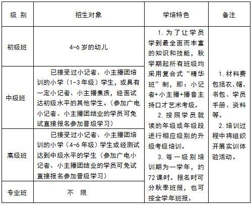 | 泰兴广电小记者、小主播团是由市委宣传部直接领导,由市教育局、市广播电视台联合搭建的旨在促进青少年儿童健康快乐成长的“节目+培训+体验”特色优质平台。该平台拥有一流的教育教学环境和设施,由名主播、名记者、名编辑组建的专业而稳定的教师团队,有中国传媒大学培训课程及方略的支撑,更有全市独一无二全媒体和大型活动实践平台的出镜亮相展示等,已圆满完成了首期380多名“小记者、小主播”初级班的培训任务,得到了学员、家长及社会的一致好评。为满足初级班学员进阶学习及热切希望参加“小记者、小主播”培训的广大学生的需求,泰兴广电小记者、小主播团秋季班(学年班)招生啦! 开班时间: 秋季班:2017年9月16日起(开学后第三个双休日)至12月底结束,每个学员双休日培训半天。 学年班:2017年9月-2018年6月双休日举行,每个学员双休日培训半天。 总课时:秋季班 36课时(18个半天);全年班 72课时(36个半天)。 班级对象: ![]() 报名时间:7月25日起(招满即止)