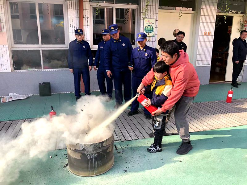紧接着,大班小朋友运用学到的知识,在消防员的指导下有序进行消防逃生演练活动。在最后的互动体验环节,消防员给大家讲解、演示灭火器的使用方法:做到一提二拔三握四对五喷,随后教师和家长代表们按照灭火器的使用方法,现场进行了灭火演练。