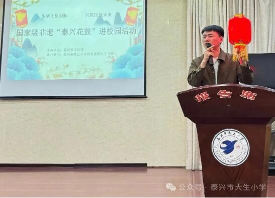 知花鼓 传文化 “泰兴花鼓”进校园活动由小主持人对泰兴市文化馆的专家——“泰兴花鼓”第八代传承人胡盛主任的介绍拉开序幕。