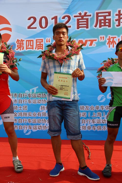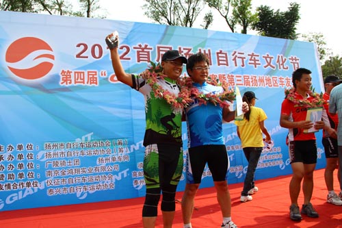 左一为选手程勇 (记者 吕晓文)8月19日,由扬州市体育局主办的2012首届扬州自行车文化节、第四届捷安特杯暨第二届扬州地区车友山地车交流赛在扬州宋夹城遗址公园举行。我市自行车运动协会作为友情合作单位组团参赛,最终,协会会员程勇夺得36-45周岁男子组冠军,刘帅荣获19-35周岁男子组第五名,蒋娟获得女子组第六名的好成绩。 据了解,这次比赛吸引了来自扬州、南京、淮安、泰州等地区的271名车友参加。这也是我市自行车运动协会组建后首次组团参赛,共派出了9名会员参加,泰州四市二区参赛者中,也唯有程勇、刘帅、蒋娟获取名次,殷杰等六名会员获得纪念奖。