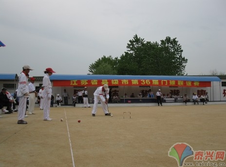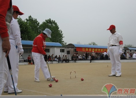 (记者 叶余华 通讯员 丁三友 摄)5月5日,江苏省县级市第36届门球联谊赛已进入循环决赛阶段,22支代表队比赛自始至终进行得十分紧张、激烈而又文明、和谐,球来球往,目不暇接,斗智斗勇,扣人心弦,惹人眼球,煞是好看。瞧!比赛现场,运动员各个精神焕发、球技娴熟。左边场地的运动员击球进门得分,右边场地的运动员则脚踏两球,用木槌打闪击球。