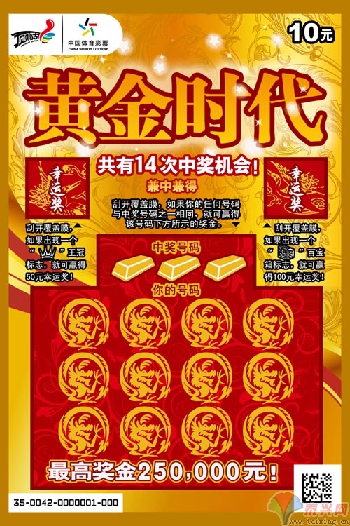 从金灿灿的票面来看,“黄金时代”可以说是顶呱刮经典的珠光宝气系列票种的延续,10元的面值,最高25万元的奖金这些关键词都是彩民再熟悉不过的了。从“三重钻石”、“百宝箱”再到如今的“黄金时代”,顶呱刮的珠宝旋风仍将逾加强劲。 “黄金时代”共有3个刮开区,最大的刮开区延续了10元票的经典数字匹配玩法,可有12次中奖机会,刮开覆盖膜,如果你的任何号码与中奖号码之一相同,就可赢得该号码下方所示的奖金;而另外两个刮开区则是该票的幸运奖区,刮开覆盖膜,如果出现王冠或百宝箱标志,就可赢得相应的幸运奖金。如果算上全部三个刮开区,“黄金时代”共有14次中奖机会,这显然也是10元票种的一个全新升级,相信会带给彩民格外的惊喜体验。 支援灾区“大爱无疆”