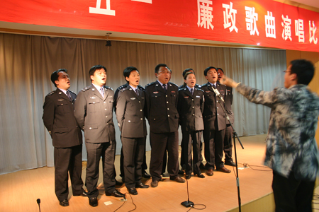作为“五一警体周”活动的一部分,4月24日晚,泰兴市公安局结合社会主义荣辱观教育,举办了庆“五一”廉政歌曲演唱比赛,从而正式拉开了该局今年“五一警体周”活动的序幕。此次比赛有20多个单位、部门的140多名民警参加,比赛的优胜单位将代表该局参加全市廉政歌曲演唱比赛。图为市看守所民警正在演《公务员之歌》。(陆裕顺)
