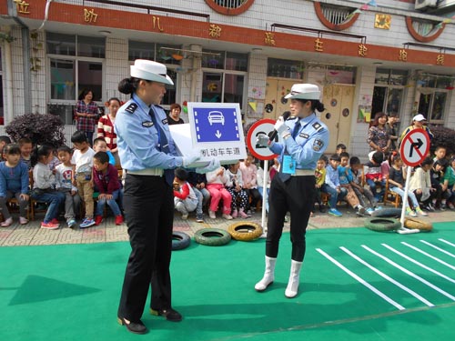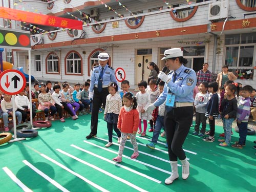 为了进一步落实交通安全宣传从娃娃抓起,5月6日下午 “全国巾帼文明岗”——江苏省泰兴公安交警大队女子班的“警花“们来到泰兴市中心幼儿园开展道路交通安全宣传活动。她们为中心幼儿园的小朋友设置了模拟交通路口、红绿灯、交通标志标线,和小朋友一起做交通安全小游戏、开展交通指挥手势表演、交通安全有奖竞答、交通标志图片识别,通过系列的活动使小朋友们认识交通、体验交通、了解交通、关注交通,同时教育了小朋友们在日常的生活中注意交通安全。活动共有300余名师生参加,受到了孩子们喜爱。( 张继军 黄新丽)