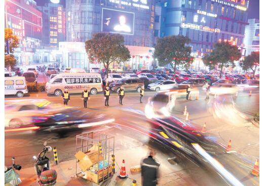1月25日,农历腊月二十八晚8时许,为保证道路通畅,市公安局交警大队新区中队的女警们在我市繁华路段,用自己的身体将车流隔开进行分流,站成一排的民警尤如车流中一堵流动的“分隔栏”。通讯员 黄新丽 陆裕顺 摄