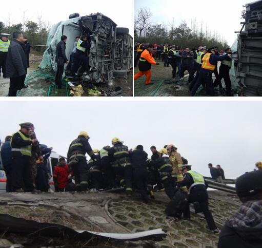 2月7日15时30分左右,泰兴公安交警大队新街中队得知有一辆车牌号位苏E5T**0的大客车从盐靖高速元竹段翻下护栏,翻在元竹某村农田里。警情就是命令,获悉情况后,中队负责人迅速组织全体警力赶赴现场,开展救援工作,用警戒带封闭现场,对卡在驾驶室的驾驶员和受伤的乘客进行救助,最终通过与消防人员的密切配合,救援成功,该车上54名乘客,无一人死亡。