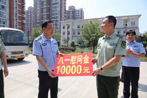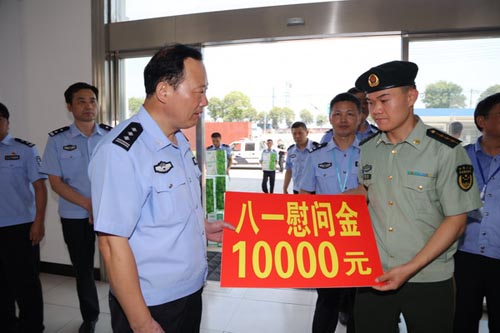 李双山同志向武警中队送上八一慰问金 7月28日上午,副市长、局党委书记、局长李双山率在家的局班子成员,先后到消防大队、武警中队,看望慰问坚守在高温酷暑一线的消防、武警官兵,向他们表示亲切慰问,致以节日的祝贺并送上了慰问金,对消防、武警官兵忠实履行职责,切实维护人民群众生命财产安全作出的贡献给予充分肯定,希望继续发扬特别能吃苦、特别能战斗、连续作战的优良作风,扎实工作,全力维稳,共同为泰兴的经济发展和群众的安居乐业保驾护航。