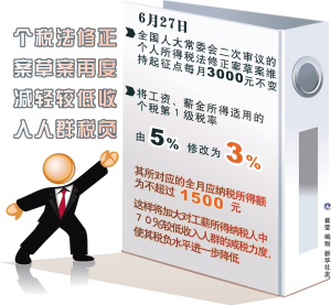 ![]() 备受社会关注的个人所得税法修正案草案27日提交全国人大常委会再次审议。关于工薪所得减除费用标准,即起征点,再审稿维持了初审稿的意见,仍拟从现行2000元提高至3000元,并未采纳此前呼声很高的进一步提高起征点的意见。