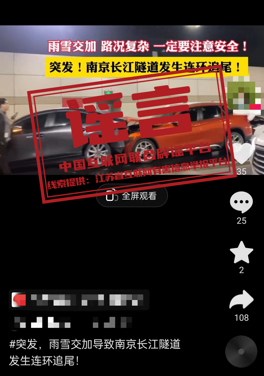 真相:12月18日,南京普降大雪,网上流传一条关于“过江隧道多辆汽车连环追尾”的视频,并以此提醒网民“下雪天注意路滑”“能不开车就不开车”,引发关注。经向公安部门核实,视频中的事故发生在2021年4月1日南京江山大街隧道内。截至目前,南京市各隧道内暂未发生较大交通事故。 在此提醒广大网民,不随意转发没有权威和正规来源的截图、视频、音频信息。不传谣、不信谣,共同营造清朗网络空间。(来源:江苏省互联网有害信息举报平台、“南京网络辟谣”微信公众号)