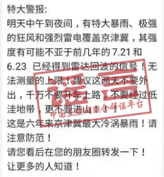 7月上旬,北方迎来汛情,一则“京津冀将迎特大暴雨”的“警报”刷屏朋友圈。事实上,该则谣言早在2017年6月下旬京津冀大雨期间就已流传。这则谣言中的“特大”“无法测量”“绝对”等字眼,引发人们的好奇心,博得了大量关注。
