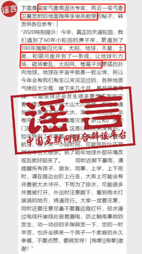 灾情愈重,谣言愈甚。此时诞生了一种谣言套路:将汛情成因归结为子虚乌有的天象——“180年周期白元年”“地球引力场、磁场紊乱”等。7月中旬,该谣言利用今年这场覆盖面广、持续时间长的强降雨,刷了一波错误认知。