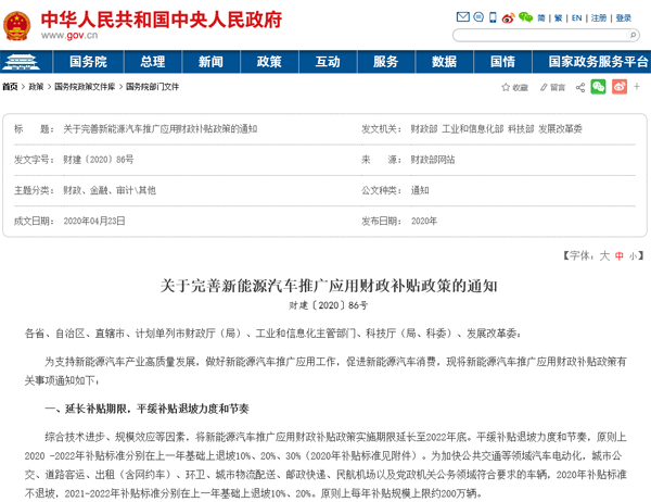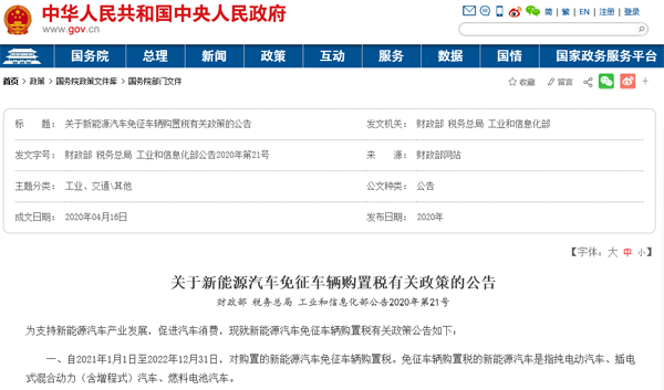△《关于新能源汽车免征车辆购置税有关政策的公告》。 购买新能源车的补贴也是同理。根据国家财政部、工业和信息化部、科技部、发展改革委2020年4月23日发布的《关于完善新能源汽车推广应用财政补贴政策的通知》,“综合技术进步、规模效应等因素,将新能源汽车推广应用财政补贴政策实施期限延长至2022年底。平缓补贴退坡力度和节奏,原则上2020 -2022年补贴标准分别在上一年基础上退坡10%、20%、30%(2020年补贴标准见附件)。”也就是说,至少在2022年年底前,购买新能源车符合技术要求的均可以享受到补贴。
