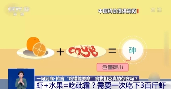 中国医师协会营养医师专委会副主任委员李增宁:这个要看个人身体状况,吃了以后不消化、胃胀,这是可能是身体弱,而不是它形成鞣酸蛋白就导致结石。这只是比较偶然的情况,大多数都没问题。 虾蟹+水果=吃砒霜? 有关食物相克的传言,还有一条流传甚广,那就是虾蟹不能与富含维C的水果同食,会引发“砒霜中毒”,这有科学依据吗? 砒霜,化学名三氧化二砷。营养成分表显示,虾蟹等海鲜食品的确含有微量砷元素,但主要为无害的有机砷,摄入后基本上会被原封不动排出体外。