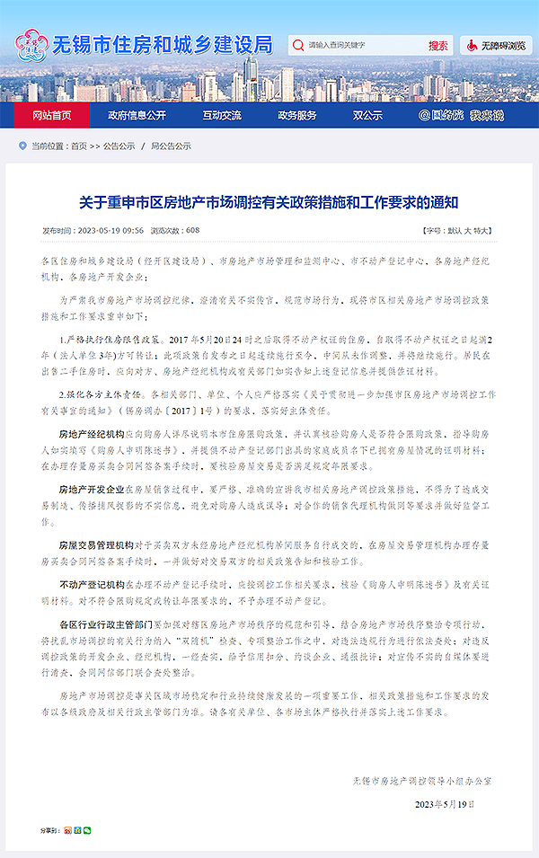 5月19日,无锡市住建局官网发布《关于重申市区房地产市场调控有关政策措施和工作要求的通知》,澄清有关不实传言,明确当地住房限售政策未作调整,并将继续施行,不满两年依旧不能过户: