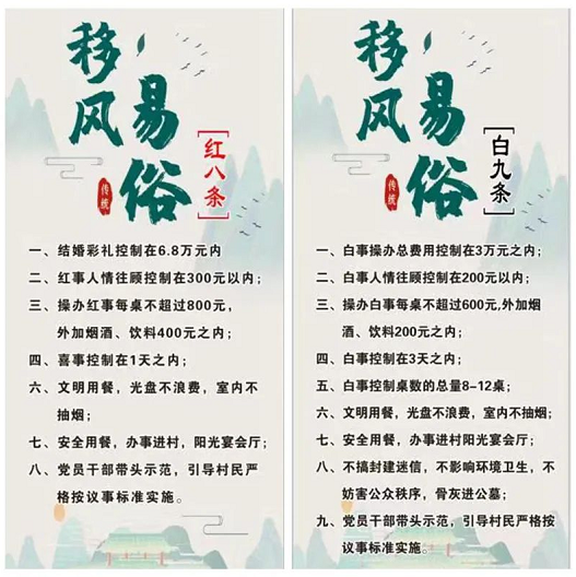 双港村严格按照红8条,白9条,操办红白事,喜事无高价彩礼积2分,控制宴请桌数积1分,控制宴请标准积1分,红白事操办进阳光宴会厅积2分,不请哭唱队积2分,文明祭祀积1分等等,实行10分制积分,积分达到一定的等级可以获得一定的物质奖励和荣誉激励。村设置移风易俗专项奖励资金,积满5分的可评为村新风文明户,同时奖励现金200元;集满10分的,除评为村新风文明户,同时奖励现金500元。