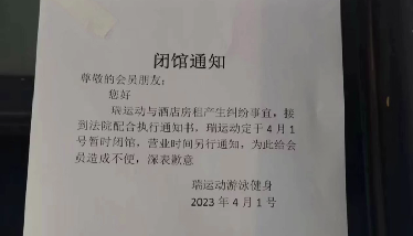 “君子之言,信而有征,故怨远于其身”,诚信是中华民族的传统美德,是做人做事的道德底线,也是社会运行的必要条件。近日,泰兴城区某酒店内“瑞运动游泳健身”在门口张贴一“闭馆通知”