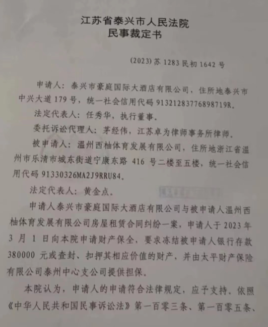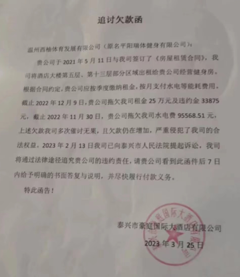 从该函中可见 健身中心拖欠酒店租金25万元 违约金3万3千余元 水电费9万5千余元