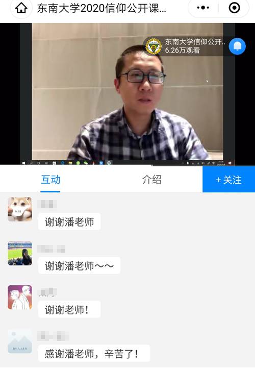 龙虎网讯(通讯员 叶菁)把课堂开进武汉金银潭医院,现场与大学生互动;把疫情防控工作中的所见所闻、所行所为、所思所想与大学生们分享……超6万人在线听讲,近5千多条评论,自3月5日开课至今,东南大学“信仰公开课——战‘疫’云讲演”已成为东南大学师生每晚期待的必修课。 直击湖北 连线中大医院重症医学航母战队 “这就是武汉金银潭医院的重症ICU病房,在这里大家可以看到医护人员们在对新冠肺炎疫情患者进行细心的治疗和照顾……”3月8日晚上,新冠肺炎国家卫健委专家组成员、国家医疗救援队队员、东南大学附属中大医院重症医学科副主任潘纯在东南大学“信仰公开课——战‘疫’云讲演”的直播间中,带领东南大学的师生们走近战“疫”红区ICU,分享那些同死神“抢人”的经历。看到潘纯出现在直播间中,评论区都沸腾了,同学们纷纷抓住机会询问潘纯医生,“现在病人的情况怎么样了?”“去一线时您害怕吗?”“您和您的团队是怎么快速适应的?生活怎么样?”潘纯医生耐心细致的一一解答,他坦言一点不害怕是不可能的,但他坚信有科学的防控技能和丰富的临床经验,每个人都不忘救死扶伤的初心使命,也正是如此,可以战胜一个个困难,而病人对他们的信任更是支持他前进的动力。