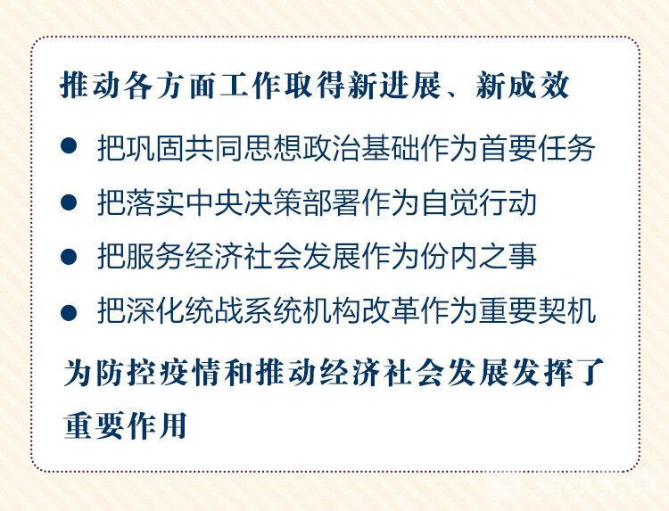 会议认为,过去一年,全省统一战线深入学习贯彻习近平总书记关于加强和改进统一战线工作的重要思想,把巩固共同思想政治基础作为首要任务,把落实中央决策部署作为自觉行动,把服务经济社会发展作为份内之事,把深化统战系统机构改革作为重要契机,围绕中心、服务大局、主动作为,推动各方面工作取得新进展、新成效,呈现出开拓进取、团结和谐的良好局面。尤其值得肯定的是,新冠肺炎疫情发生以来,全省统一战线积极响应号召,迅速行动起来,发挥特色优势,踊跃捐款捐物,广泛凝聚携手同心战“疫”情、同舟共济克时艰的统战力量,为防控疫情和推动经济社会发展发挥了重要作用。