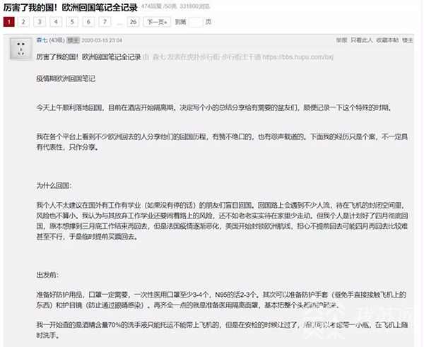 赵先生在网络社区发表的文章点击已有30多万次 今年年初,旅居法国多年的扬州人赵先生辞去了当地的工作,准备在4月正式回国生活。但近期欧洲各国新冠疫情蔓延日益严重,赵先生决定提前回国。3月14号,他带好防护设备,登上了回国的飞机。