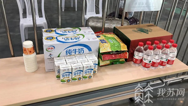 等待区内有各种食品免费供归国人员食用 “等的时候有很多水啊零食放在那,想吃都可以吃。因为江苏省的政策就是上海坐一个大巴,到昆山国际会展中心按城市再分成等待区,这时候我就去扬州的等待区。等一会工作人员就喊你,把你送回扬州。”