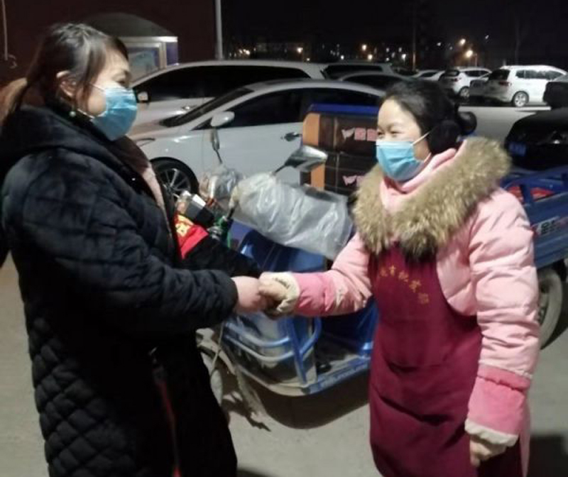 方便面、面包、点心、水果、奶茶、八宝粥等“团聚”在包小芳的三轮车里。送方便面时,她会提前准备好开水;送奶茶时,她现场帮大家冲;送八宝粥时,她就在家里事先加热好。临走时,她还不忘把垃圾带走。 “大姐呀,你不用每天都给我们送饭,你天天给我们送饭,我们心里也过意不去。”泗洪县公安局交警大队二中队警员刘恒权看着眼前这位大姐天天给大家送饭,有点心疼。 据刘恒权说,起初他们也不知道包小芳的名字,只见她每天早上6点多就把饭送到值班人员手中了。经常变着花样给他们做饭,元宵节还特意包了饺子和汤圆送到执勤点。每次她都是戴着口罩、围着围巾,把自己包裹得严严实实的。问她姓名,也不说,想给她拍张照片,也躲着不让拍。还是后来被一位认识她的群众认出来了,大家才知道她叫包小芳。 2月22日,双沟镇的十几处疫情防控检查点全部撤除,一位坚持27天、风雨无阻为检查点执勤人员送饭的包小芳,兑现了她的承诺,骑着三轮车默默离开。 记者采访得知,包小芳其实姓宋,婚后,大家跟着她丈夫的姓叫顺口了,于是都叫她“包小芳”。据邻居说,包小芳与丈夫包顺白手起家,在双沟镇农贸市场经营一家批发部,因为资金周转问题,她家至今还欠着十多万元外债,但夫妻二人平日里诚信经营,乐善好施,经常帮助人。 包小芳平凡得像一朵小花,那么实诚,那么自然地绽放,但又让人领略到一种闪光的品格——践诺。 诚信粮油企业:疫情期间绝不涨价