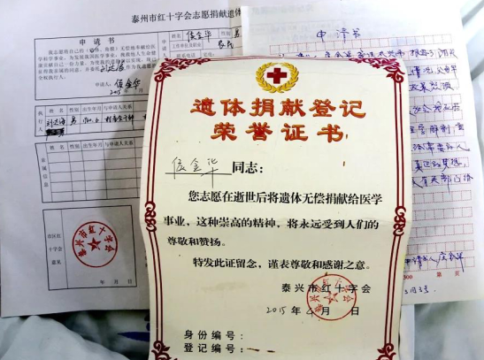 从电视里,侯金华知道了“遗体捐赠”这件事,在跟外甥女多方打听后,老人做出了决定:“死后遗体捐赠。”他告诉外甥女陆正芳:“我没有钱,也没有子女,一辈子受共产党照顾,也没有好回报的,既然遗体捐赠对国家有帮助,那就捐出去。” 临终前,不忘身边的文件袋 2018年4月,老人患贲门炎,先后辗转泰兴市人民医院、泰州市人民医院、泰兴市中医院等医院就医,“每次去医院,舅舅都要把捐赠书带在身边,反反复复的嘱咐我们,不要忘了。”陆正芳说。 2020年3月24日,老人已到弥留之际,他又一次拉住陆正芳的手:“别忘了,我交代的这件大事,一定给我办好了。”直到陆正芳再三保证,他才放下心来。陆正芳说:“舅舅是个农民,没有什么文化,但是他做的这件事,值得我们每一个人尊敬。”
