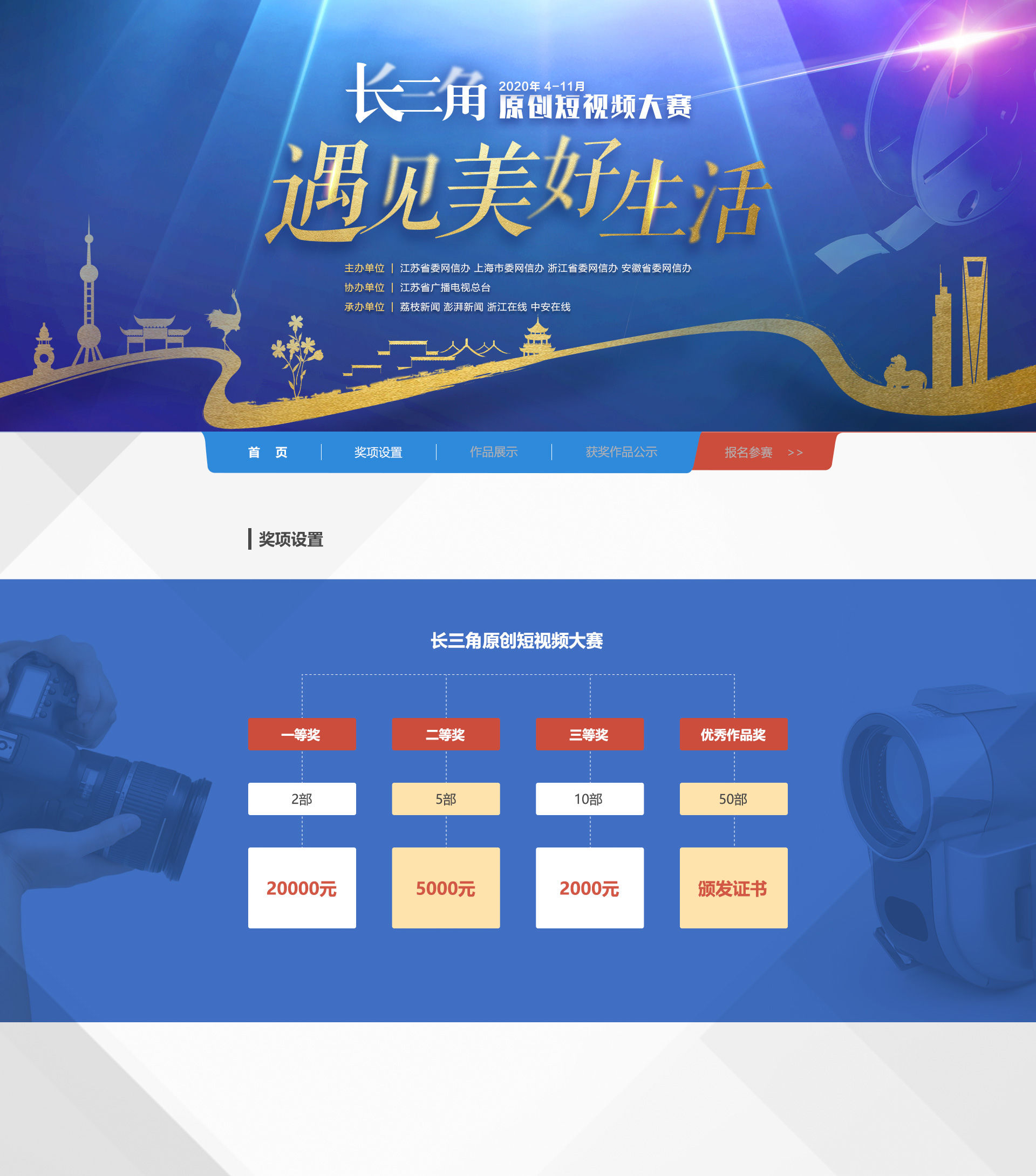 奖项设立丰富且权威!机会属于你! 参赛方式包容并蓄,不拘一格邀佳作!大赛设立“遇见美好生活”——主单元,与“小康”模样——特别单元,横(屏)竖(屏)皆可,甜咸不忌。关于我们所处的这个美好时代、身边的美好生活,发现、记录或是讲述,敬请点燃你的创作小宇宙,不吝赐教。 划重点!关于本次大赛你需要知道的一切—— 【Q:“遇见美好生活”长三角原创短视频大赛是什么?】 这是一个集权威性、含金量、影响力于一身的专业性大奖赛!它将以解读、诠释全面小康的深刻内涵为主题,面向长三角乃至全国视频爱好者和网友发出创作邀约。 【Q:谁可以参赛?】 热爱短片创作的任何个人和集体。 【Q:大赛主题是什么?】 “民亦劳止,汔可小康。”绮丽愿景穿越千年,在我们身处的这个时代,照进现实。今年的大赛主题是“遇见美好生活”,旨在透过不同创作主体的多方视角,鼓励综合运用多种视频表现手法和呈现方式,点赞长三角地区小康社会建设取得的丰硕成果,聚焦人民幸福安康的美好生活。 【Q:参赛作品分几类?】 1、主单元——“遇见美好生活” (1)微电影 (2)微纪录片 (3)公益短片 (4)动画短片 2、特别单元——“小康”模样 【Q:参赛作品要求?】 1、内容题材要求 主单元——“遇见美好生活”:透过城乡建设、行业发展、家庭变迁、个人成长等不同维度,聚焦长三角地区全面小康的生动实践,用光影描绘美好生活。题材不限,形式不限。 特别单元——“小康”模样:以“微访谈”、随手拍的形式,展现不同群体心中的“小康”模样。视频需为竖屏形态。 参赛作品必须符合国家法律、法规和版权有关规定,无色情、暴力、血腥等不良内容。要求题材好、创意新,契合主题、情节完整。 2、时长要求 所有作品时长只需3分钟 无论是报送主单元或是特别单元,都不要超过3分钟哦。 3、格式要求 参赛作品以mp4为主,avi、flv、mpg、wmv为备选格式。特别单元参赛作品需为竖屏短视频。 4、上传要求 参赛作品大小控制在300M以内,如超过建议压缩后上传。 5、版权要求 参赛作品必须由参赛者本人(或单位)原创,严禁剽窃、抄袭,参赛者应拥有作品的著作权。主办方对全部参赛作品具有免费使用权。主办单位不承担包括(但不限于)肖像权、名誉权、隐私权、著作权、商标权等纠纷而产生的法律责任,如出现上述纠纷,主办方保留取消其参赛资格及追回奖项的权利。 6、创作时限 参赛作品必须是网络首发,并且是2020年1月1日起创作的短片。 【Q:奖项设置】