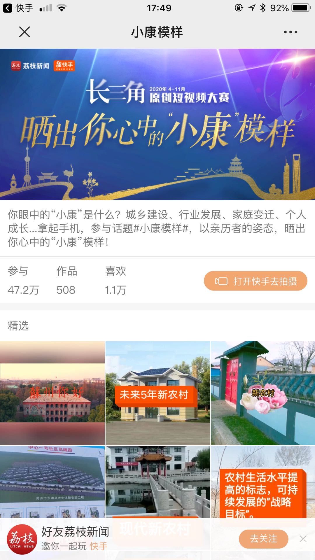 “小康”是什么? 是劳有所得,是住有所居,是幼有所教,是老有所养,是病有所医……“小康”是踏踏实实的安全感,是满满当当的获得感,是真真切切的幸福感。 一路走来,“小康”经过了数代人的努力,也为数代人所见证。从奔小康,到初步实现小康,再到决胜全面小康,人们对于美好生活的向往,正一一兑现。“小康”就是我们此刻正在经历的美好生活。 走过改革开放的40年,新中国成立的70年,步履不停,我们迎来决胜全面小康的2020。值此之际,“遇见美好生活”长三角原创短视频大赛即将开赛!邀你一起开启创作模式,用光影“作画”,记录属于“全面小康时代”的“美好style”。 本届大赛由江苏省委网信办、上海市委网信办、浙江省委网信办、安徽省委网信办主办,荔枝新闻、澎湃新闻、浙江在线、中安在线承办。
