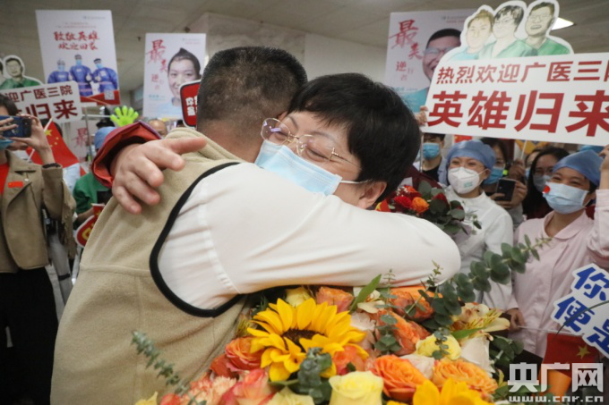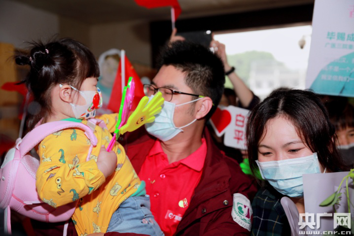 广州援鄂医生休整结束返院(央广网发 院方供图) “以后,也请让我好好照顾你” 离家两个多月,家人最是牵挂与担忧,如今团聚,那份幸福难以言表。