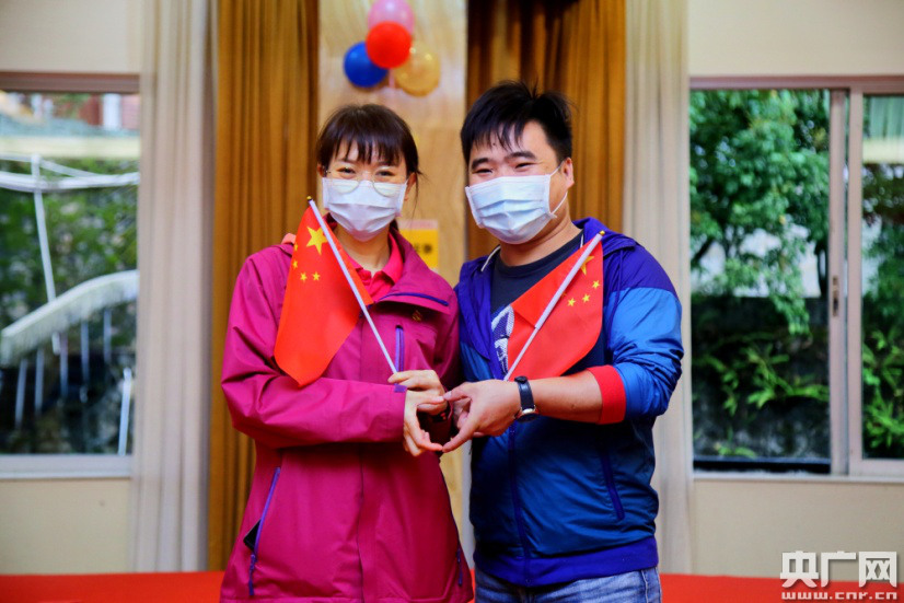 广医三院援鄂医疗队队员段业英(左)和男友(央广网发 院方供图) “我所能够做的,就是在她抗疫期间,用我全部的空闲时间陪伴她。”段业英的男友现场深情表白:“以后,也请让我好好照顾你、陪伴你!” |