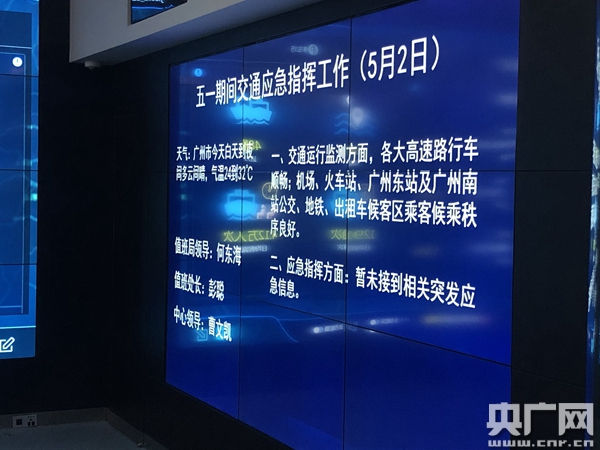 广州市交通信息指挥中心。(央广记者 廖开迪 摄) 广州市交通信息指挥中心工作人员陈宇兴表示,广州市交通运输部门预测返程高峰将会出现在假期第四日(5月4日)15时-21时,假期第五日(5月5日)13时-23时两个时段。 “这两个返程高峰中,我们预测假期第五日(5月5日)返程客流、车流量最大。在此,我们提醒广大市民和旅客在五一假期出行时要科学规划好行程,错峰出行;同时,持续强化自我防护意识,出门佩戴好口罩,服从现场工作人员的指引,安全有序出行。” 为满足市民出行和返程客流需要,针对预测的返程高峰,广州地铁将于5月3日至5日,每天延长地铁二号线广州南站往嘉禾望岗方向运营服务时间30分钟,同时,还将根据相关站点客流变化情况,适时组织采取疏导管控措施、调整运输组织方式。 公交方面,市交通运输部门将进一步强化广州塔、花城广场、体育中心等各大旅游景点与商业区域途经公交线路运营服务,加密班次、适当延长服务时间,保障市民公交出行需求。 |