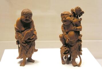 明清时期,民间文物上的“微笑”元素俯拾皆是。南博雕塑馆陈列的一对明清木雕“和合二仙”洋溢着欢乐的气氛。由寒山拾得演变而来的“和合二仙”多以快乐的面目出现,是苏州刺绣、无锡泥人等江苏非遗艺术中常用的创作题材。在南京的高淳博物馆,记者见到了一件“春风得意马蹄疾”的砖雕,这幅画面出自唐代诗人孟郊《登科后》的诗句“春风得意马蹄疾,一日看尽长安花”。科场连捷的主人公走上了人生巅峰,纵马驰骋,开怀大笑。保留在江南各地的大量明清古建筑的石雕、砖雕、木雕上,有很多类似的吉祥图案,“微笑”画面比比皆是,表达了古代江苏人对生活美满、诸事顺心的期盼和祝愿。