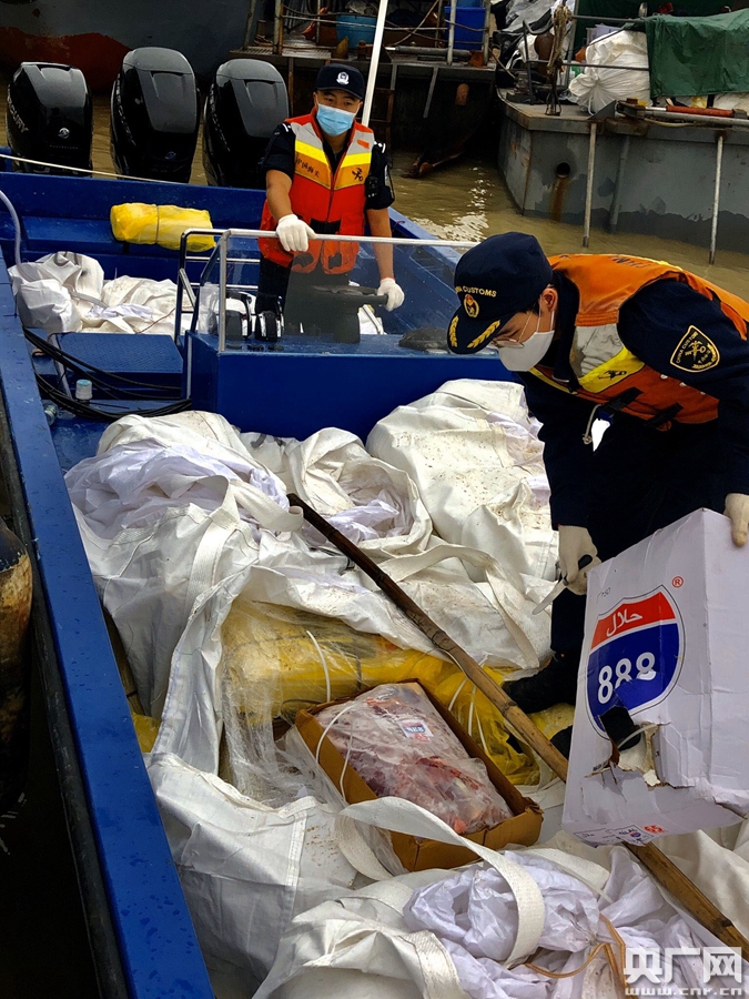 广州海关缉私警察组织吊装清点所查获的走私冻品(央广网发 广州海关供图) 央广网广州5月8日消息(记者郑澍 通讯员关悦)据广州海关5月8日消息,今年以来,广州海关缉私局积极开展“奋战珠江口”水上缉私专项行动,加大对珠江口水域走私活动的打击力度。前4月共查发水上渠道案件398起,案值达1.846亿元,查扣各类走私成品油4781.47吨、冻品4096.3吨。 查获“蚂蚁搬家”走私“大渔群” 4月10日晚上20时至次日早上8时,广州海关所属顺德缉私分局采取声东击西、拉网围猎等战术,连续作战12小时,在深圳宝安机场对开至沙角电厂附近水域,接连查获走私“红油”的流动渔船7艘,查获走私冻鸡爪、冻猪蹄的“三无”(无船牌名号、无船舶证书、无船籍港)船只13艘、走私冻牛肉的1050匹马力高速快艇1艘(俗称“中飞”),共查扣走私“红油”230多吨、冻品160多吨。 “走私人员发现海关缉私艇追击后,有的利用尾随的快艇掩护弃货逃窜,有的则强行冲滩。”顺德缉私分局水上缉私民警介绍,仅3月10日至4月11日一个月的时间里,顺德缉私分局在珠江口水域查获水上走私案件70起,查扣用于走私的各类“三无”船只48艘,查扣走私“红油”660多吨、冻品510多吨 。 4月18日傍晚,广州海关所属大铲缉私分局经过研判分析,判断可能多艘走私“红油”的流动渔船将于夜间“蚂蚁搬家”集体闯关,遂出动两艘缉私艇在南沙港水域设伏。当晚19时45分,可疑渔船出现在目标水域,海关缉私艇马上亮警灯、鸣警笛,迅速控制了这个“大渔群”。经逐一登船清点,查获走私流动渔船多达14艘、涉案人员共32名,现场查扣涉案“红油”600吨。 为安全将多艘涉案船只押回大铲锚地进行调查,海关缉私警察随机应变,命令涉案船只一字排开用绳索连接固定,并安排人手在“铁索连船”上监视涉案人员驾船,同时,两条缉私艇在四周来回巡逻,严防涉案船只脱逃。经调查,这些流动渔船在香港过驳“红油”欲伺机运回内地销售,海关缉私警察共查扣涉案“红油”600吨。
