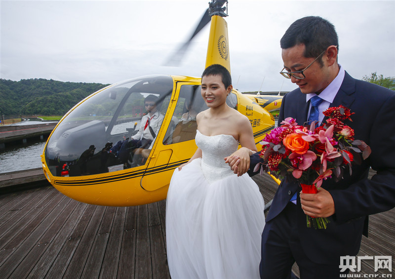 浙江省淳安县今天为战“疫”情侣代表举办空中婚礼(央广网发 王建才 摄) 在新冠病毒肆虐的初春,为抗击疫情,许多医护青年主动推迟了自己的婚期,全力投身抗疫一线。今天的空中婚礼寓意“白衣天使”归来。六位新娘身穿洁白的婚纱,乘坐直升机来到新郎身边。