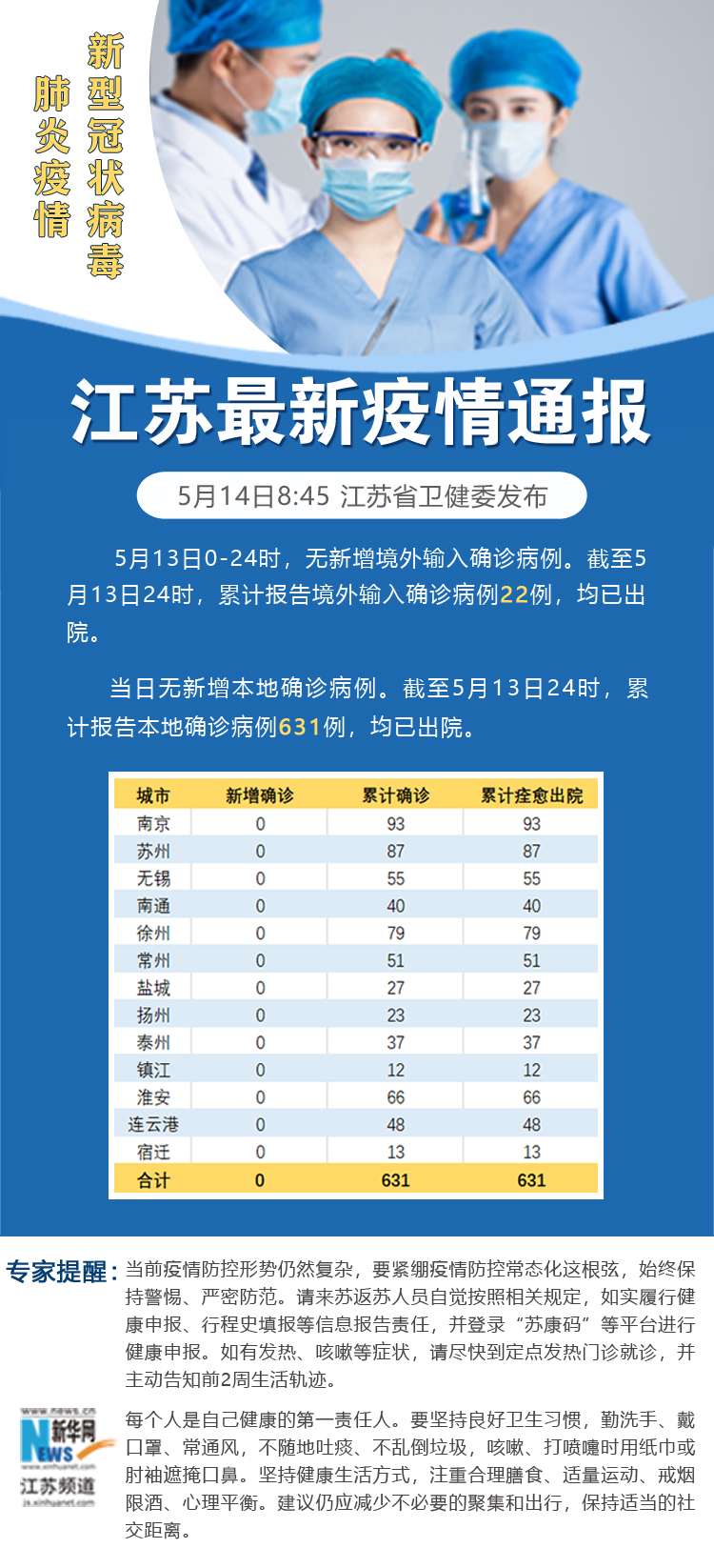 5月13日0-24时,无新增境外输入确诊病例。截至5月13日24时,累计报告境外输入确诊病例22例,均已出院。 当日无新增本地确诊病例。截至5月13日24时,累计报告本地确诊病例631例,均已出院。 当日无新增无症状感染者,尚在定点医院集中隔离和医学管理的无症状感染者1例,为境外输入。 目前,追踪到确诊病例和无症状感染者的密切接触者13637人,均已解除医学观察。 专家提醒:当前疫情防控形势仍然复杂,要紧绷疫情防控常态化这根弦,始终保持警惕、严密防范。请来苏返苏人员自觉按照相关规定,如实履行健康申报、行程史填报等信息报告责任,并登录“苏康码”等平台进行健康申报。如有发热、咳嗽等症状,请尽快到定点发热门诊就诊,并主动告知前2周生活轨迹。 每个人是自己健康的第一责任人。要坚持良好卫生习惯,勤洗手、戴口罩、常通风,不随地吐痰、不乱倒垃圾,咳嗽、打喷嚏时用纸巾或肘袖遮掩口鼻。坚持健康生活方式,注重合理膳食、适量运动、戒烟限酒、心理平衡。建议仍应减少不必要的聚集和出行,保持适当的社交距离。 |
