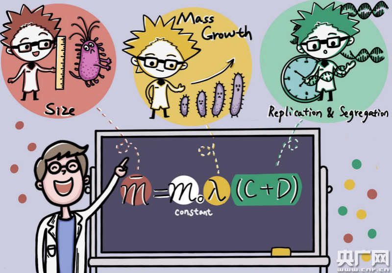 个体生长分裂方程示意图(央广网发 深圳先进院供图) 新的方程统一了不同生长速率条件下的细菌细胞周期调控机制,这一定量公式的提出也使得细菌个体大小、生长速率等自然现象具有了一定的可预测性。例如:当得知细菌生长速率和DNA复制周期,便可准确预测出细菌的大小。该分裂方程为研究人员提供新的研究范式和思维方法,解答细菌细胞大小和DNA复制周期以及生长速度之间的关系,并具有广泛的应用价值。 “个体生长方程”对理解细菌细胞周期的控制机制有什么意义呢?在“个体生长方程”的约束下,研究团队对细菌细胞分裂的控制机制进行了探讨,并以此为基础提出了一个全新的分子机制假说,认为存在一种“分裂许可物”,它与“细胞生长”和“染色体复制分离”相关。当它积累达到一定阈值时,细胞就会分裂。研究团队在此基础上建立了相应的数学模型,进一步的实验确实验证了理论预测。 从数学公式到建构生命体理性设计基础 在物理世界,“伯努利方程”指导了飞机的设计,“阿基米德浮力定律”推动了潜艇的面世,“牛顿第二定律”是人类得以翱翔太空的理论基石,合成生物学的终极目标就是生物世界实现理性设计、改造现有生命形式或者创造全新的生命形式以满足人类不同的需求。 以“合成生物学”为研究导向,刘陈立团队继去年揭示细菌群体迁徙公式后,该研究是在定量生物学领域的再度突破,“研究再次证实了定量的思维方法在生命科学研究中的重要性,我们找到的每一个运行规律,都是试图找到可用于指导设计、改造、重建生命形式的‘图纸’。”刘陈立表示。此次对细菌个体细胞相关定量规律和法则的基础科学问题研究,对人类揭示并理解生命体内在原理提供了重要的参考依据,此研究也有助于未来合成生物学领域的理性设计和建构,以满足细菌治疗疾病、抗生素替代、绿色生物制造等多个应用层面的需要。 |