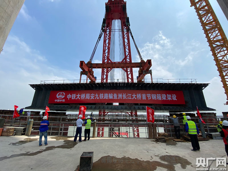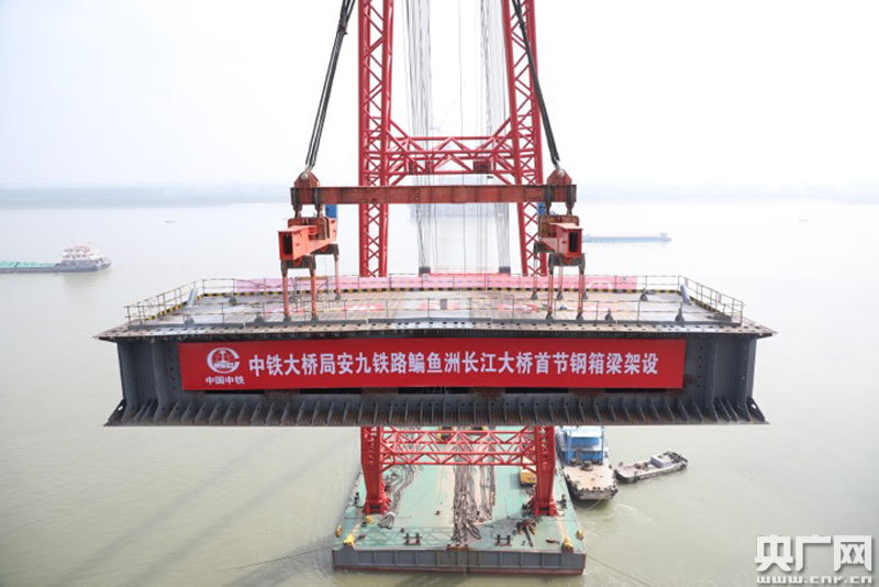 鳊鱼洲长江大桥首节钢梁架设现场(央广网发 通讯员熊旺平 提供) 安九铁路鳊鱼洲长江大桥由武九铁路客运专线湖北公司承建、中铁大桥院设计、中铁大桥局施工。大桥为4线铁路大桥,其中两线为高铁线,时速350公里;预留两线为客货线,时速200公里。其中南汊航道桥全长1320米,为主跨672米的双塔双索面交叉索斜拉桥。