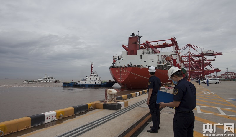 央广网上海6月3日消息(记者傅闻捷 通讯员王亮 韩帅)今天上午10点20分,载运着10台轨道吊的“振华32”轮在洋山港海事局船舶交通管理中心远程监控和现场“海巡011”轮的护航下顺利靠泊洋山港四期自动化码头。