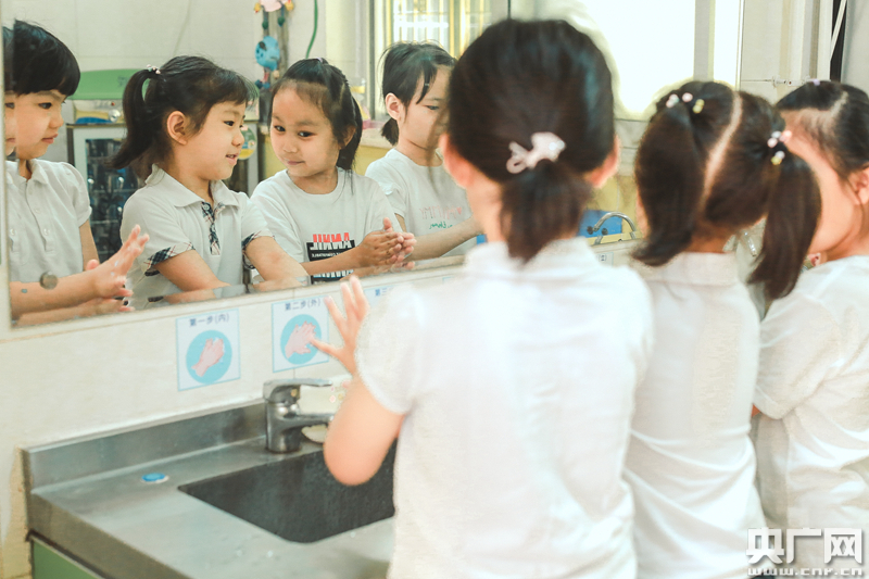 “神兽”们开学了。(央广网记者 柴安东 摄) 为了保证顺利复园,幼儿园的教职工们提前进行了6次防疫演练,“从入园时家长来送孩子,一直到晚上放学家长接孩子,然后是突发应急状况,入园时的突发,在校期间的突发怎样处理,我们是全套演练下来的。”老师田艳霞告诉记者。
