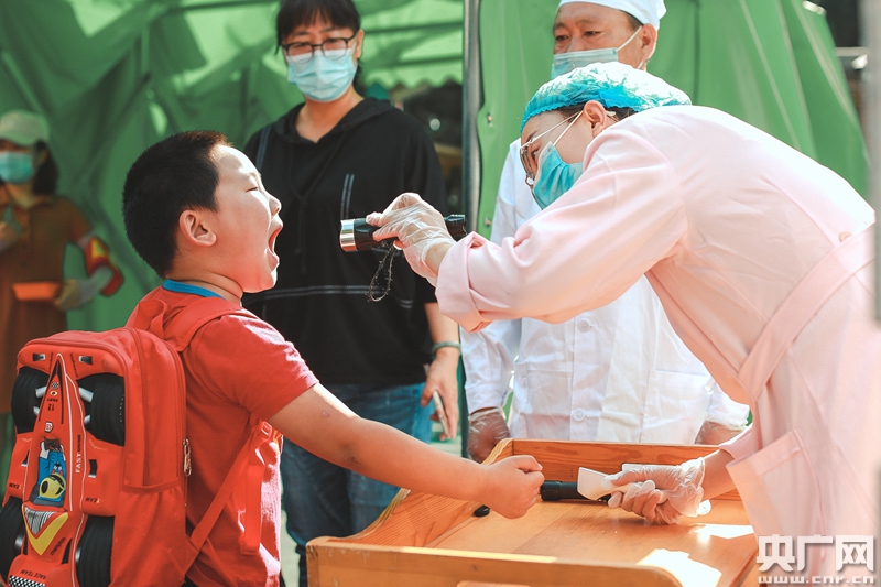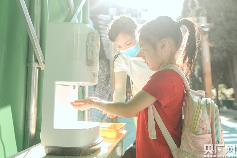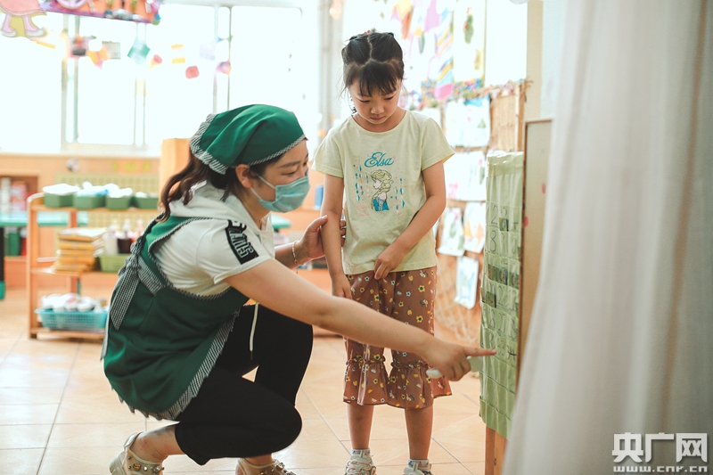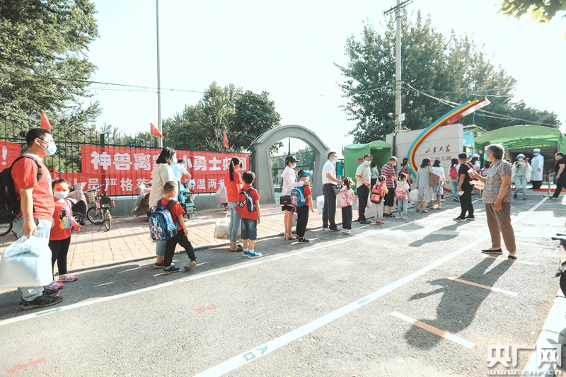 “神兽”们开学了。(央广网记者 柴安东 摄) 为了保证顺利复园,幼儿园的教职工们提前进行了6次防疫演练,“从入园时家长来送孩子,一直到晚上放学家长接孩子,然后是突发应急状况,入园时的突发,在校期间的突发怎样处理,我们是全套演练下来的。”老师田艳霞告诉记者。