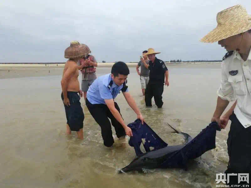 遂溪海洋综合执法人员救起搁浅海豚(央广网发 通讯员供图)