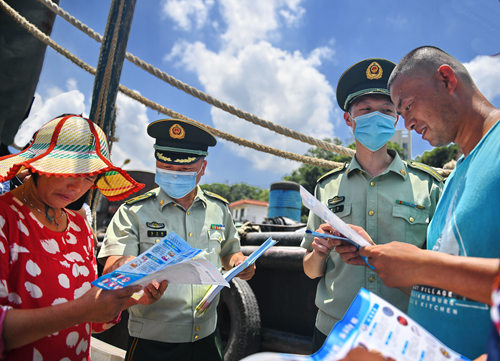 海警执法人员为渔(船)民朋友开展普法宣传(福建海警局 袁冠卿 摄) 同时,福建海警局还成立了多支海上禁毒宣传小分队,利用执勤巡逻间隙,深入辖区港澳口、渔船排、码头等人员聚集地,通过张贴条幅标语、发放宣传单、现场答疑解惑等方式,向广大渔(船)民介绍毒品对社会、家庭和身体健康的危害以及海上毒品走贩私活动的现状,并鼓励他们通过海上“95110”报警电话,积极举报涉毒违法犯罪行为。 据了解,受高额利润驱使,一些不法分子不惜铤而走险,踏上制毒贩毒的违法犯罪道路,给社会带来严重危害。作为福建海域海上的重要执法力量,福建海警局坚持守海负责、守海担责、守海尽责,始终保持打击海上毒品走私犯罪的高压态势。近年来,该局连续侦破重特大毒品案件9起,查获各类毒品3.6吨、易制毒物品近2吨,用实际行动构筑起海上禁毒的钢铁长城。 |