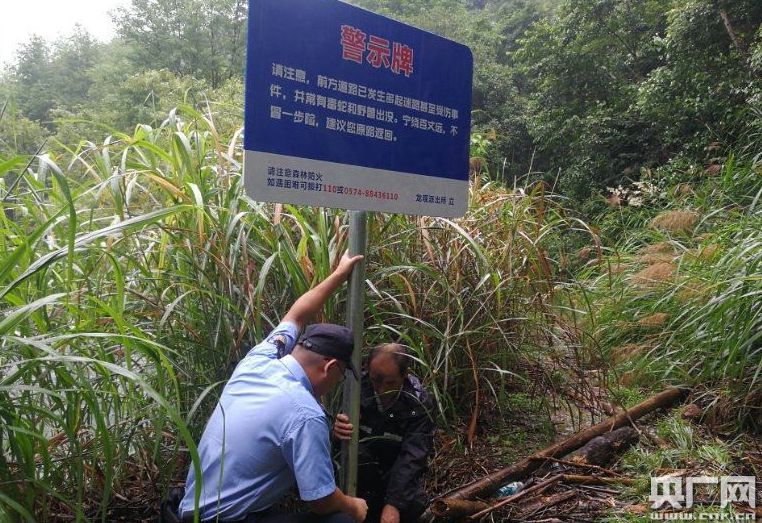 民警在溪坑旁树立警示牌(央广网发 通讯员供图) 央广网宁波6月21日消息(记者曹美丽 通讯员段晓鹏 张飞)越来越多的驴友选择去“探险”,他们专走偏僻野路,虽然险中求乐,但危险也随之而来。在宁波市四明山区,每年都会发生十几起“驴友”遇险求助警情。有没有办法减少驴友“遇险”事件的发生?近日,位于宁波四明山区的龙观乡派出所想出了一个“土办法”:他们在山区险要位置新设了20块警示牌,警示牌除了劝导游客文明旅游外,还可以充当救援“定位器”的作用。 每年发生紧急救援事件十几起 宁波市海曙区龙观乡有五龙潭风景区、半山半水度假村、中坡山森林公园等等,颇受游客欢迎。 “喂,朱教导,我是南坑村的老李头,上午我们见过面聊过的。你们走后不久就来了批游客,他们点了火在烧烤,我和你们反映一下。”6月13日下午,龙观乡的一位村民向派出所教导员朱建波反映。 “还有许多游客喜欢来这野餐、烧烤。有些带着小孩的一家人,铺个小垫子,支个烧烤架就开始烧烤。有次有户游客引火把杂草烧起来,幸好就在溪边,拿水泼灭,才没出大事。”清溪附近“龙观禅那”民宿的老板说。 相比火灾而言,最揪心的还是一些紧急救援的事情。比如在该乡中坡山的小瀑布,有游客就把帐篷搭在旁边,但是山里的天气阴晴不定,风雨大时,山夹谷间溪坑里的水涨起来,很快就漫过大腿,非常危险。还有些甚至在溪上的大块石头上搭帐篷,由于天气预报的偏差或者低估了雨量,就被上涨的溪水困住。“每年夏天,都能遇十几起这样的救援,让我们疲于应对。”朱建波说。
